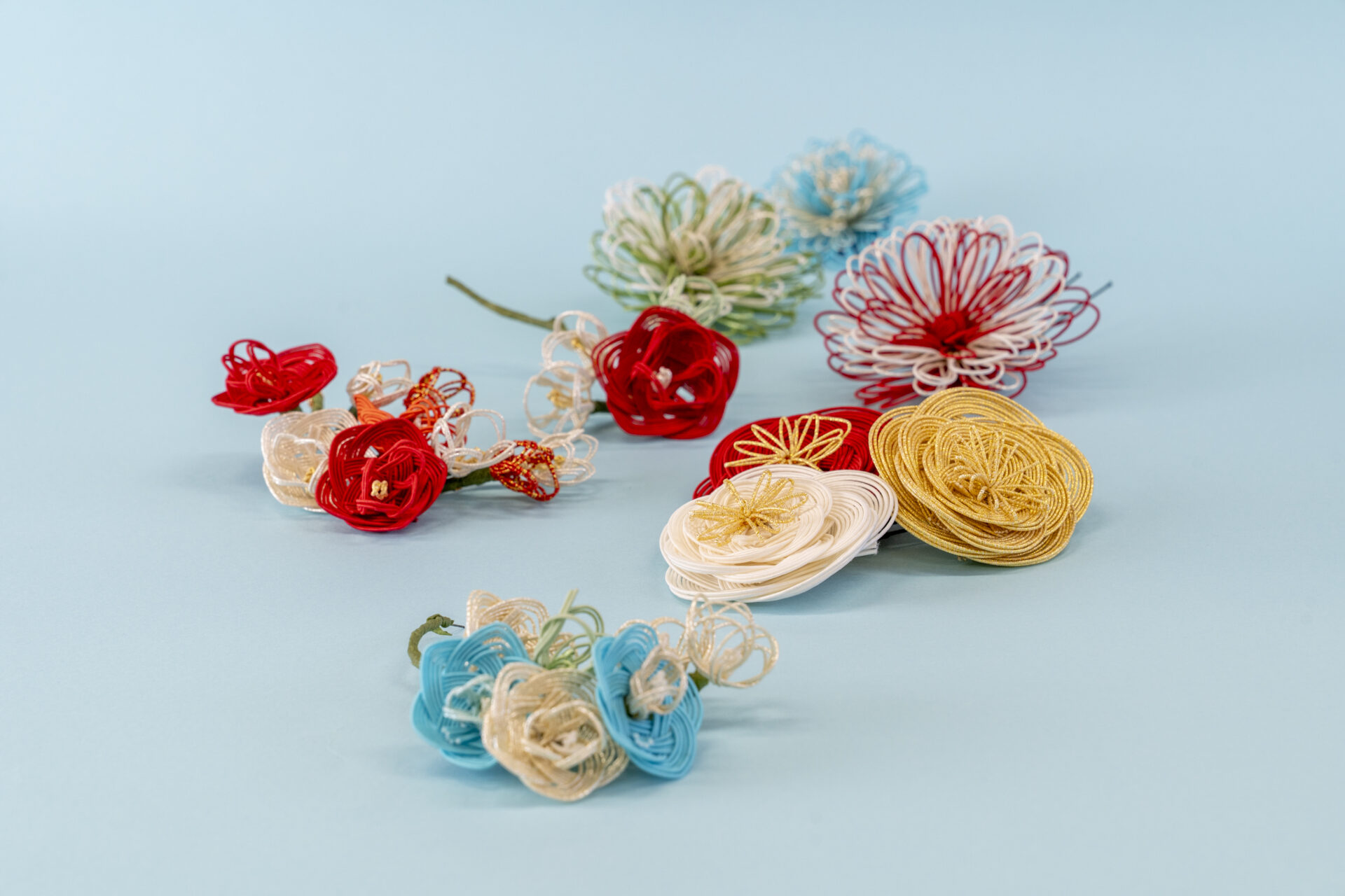 様々な色でサイズを変えて、飾りをパーツごとに分けて作りました。成人式の晴れ着に色や雰囲気に合わせて使っていただいております。