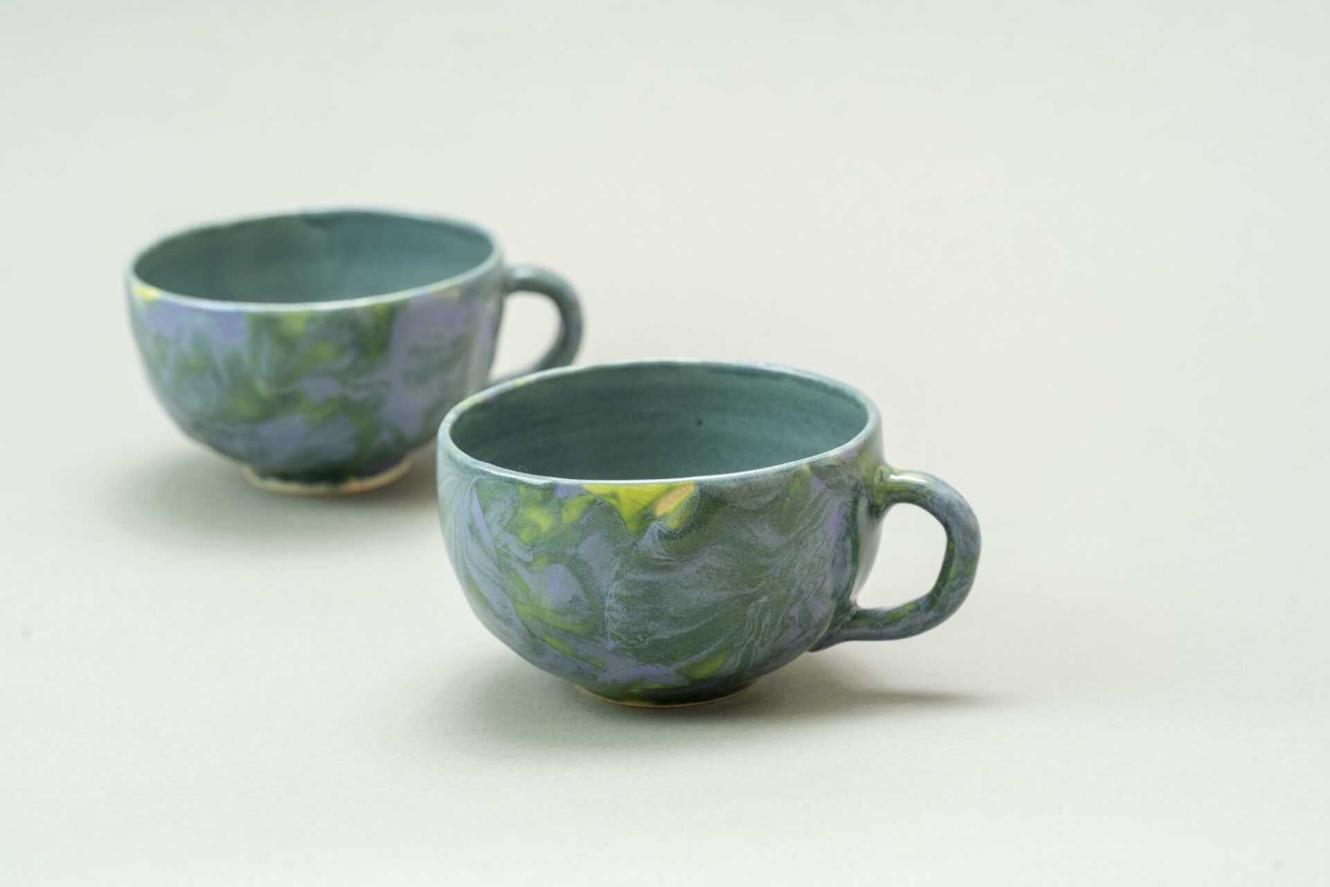 絵の具が混じり合いエキゾチックな柄を紙に写し取るマーブル紙をヒントに、陶器にもこの技法が使えないかと考えました。二つの釉薬を混在させ、柄を器に写し取るように施釉しました。2つと無い柄が浮かび上がりしました。色のバリエーションを増やしていきたい。