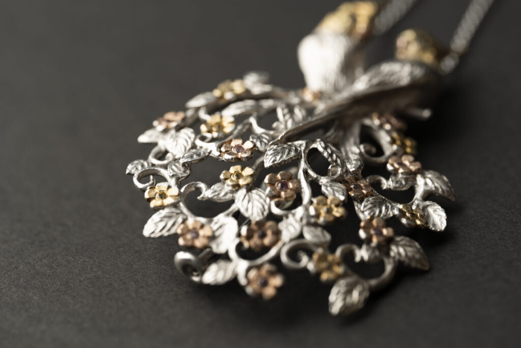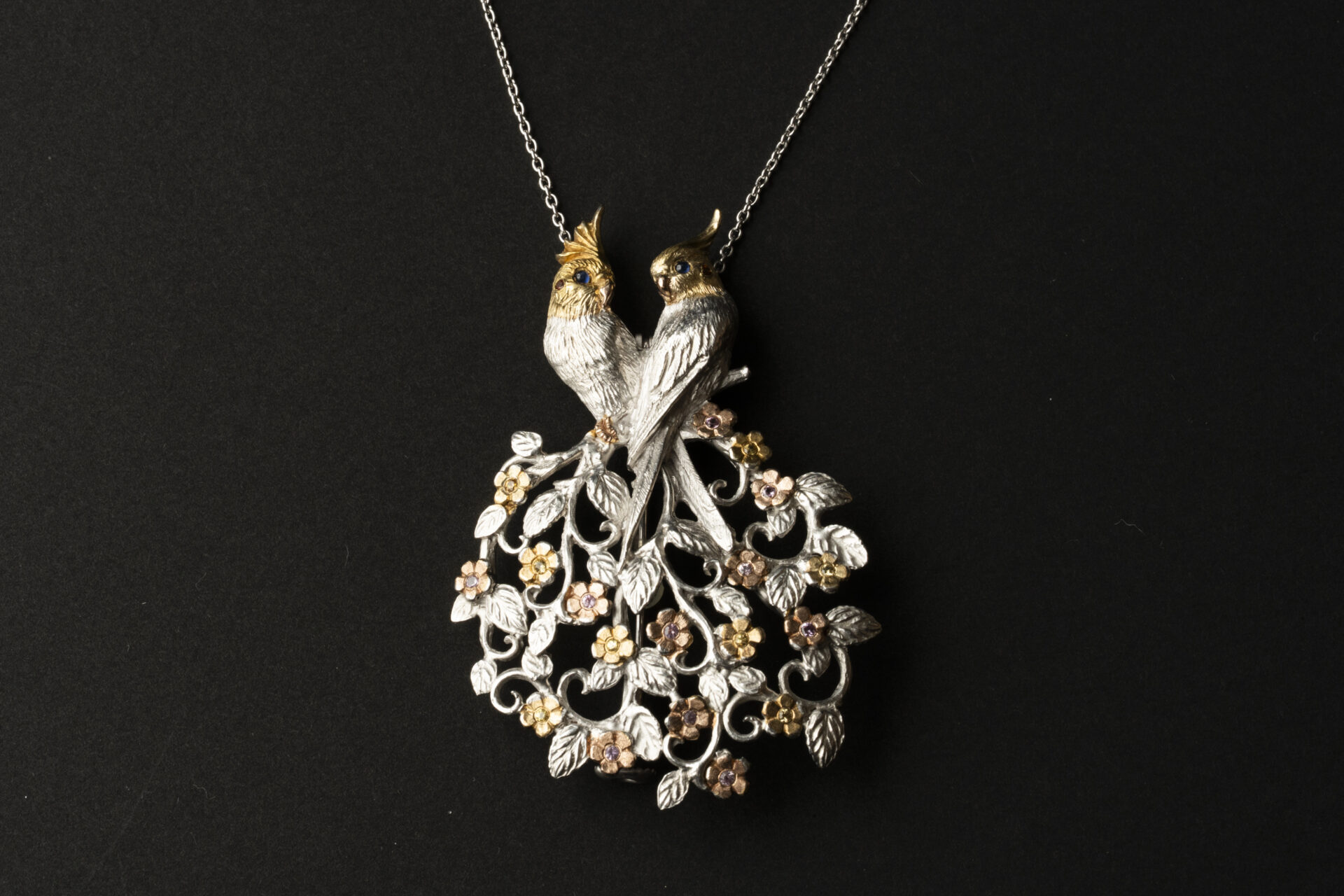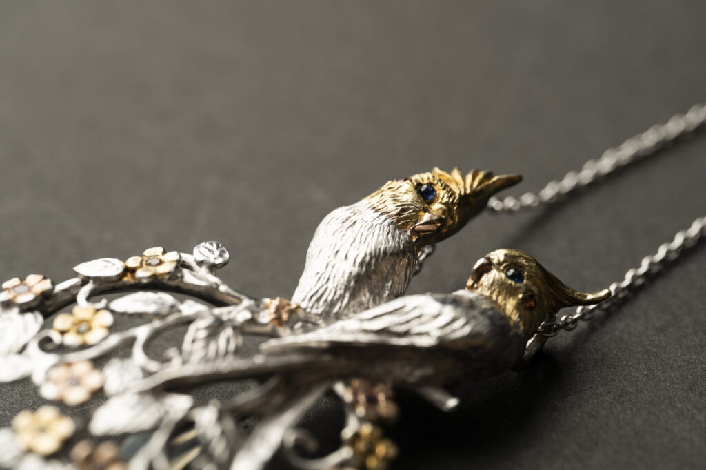 シルバー925を使い、2羽のオカメインコと花をあしらった華やかなブローチペンダントに仕上げました。目や鼻の中心にはカラーサファイアを使いました。