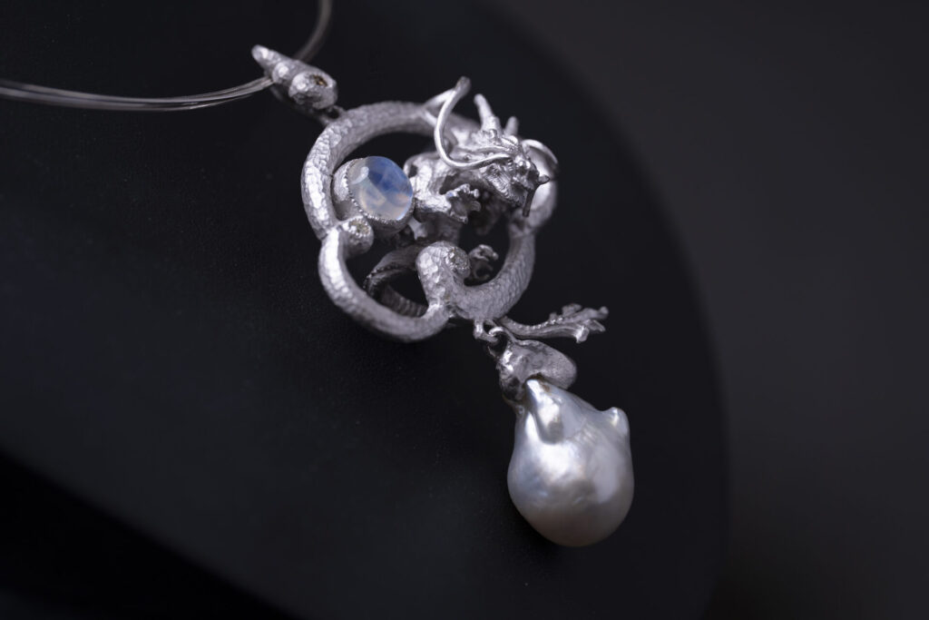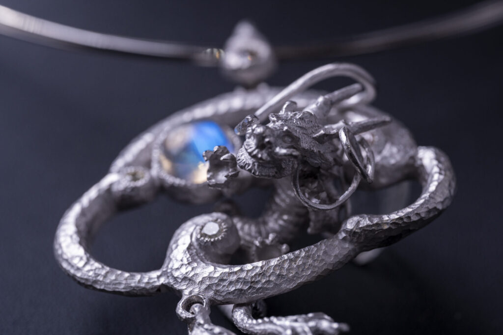 珠を抱いた龍が、雲を裂き、天上へと舞い上がる瞬間をかたちにした作品。