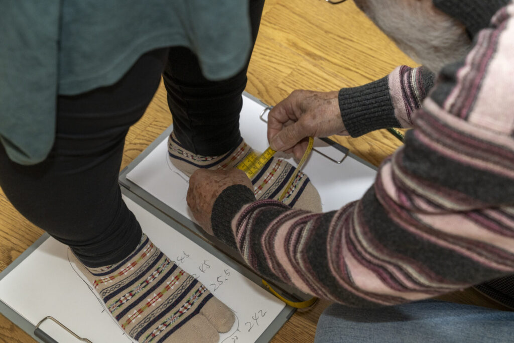 足の採寸。足長だけではない、細部のデータをとる